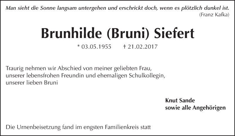 Hier finden Sie alle Traueranzeigen aus der Zeitung, die bisher für Brunhilde Bruni Siefert erschienen sind. Weitere Traueranzeigen, die in der Zeitung erscheinen, werden hier ebenfalls aufgelistet