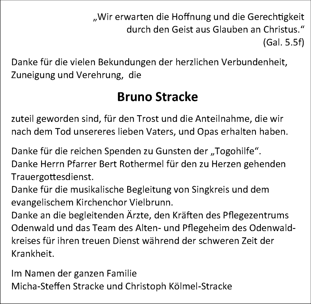 Hier finden Sie alle Traueranzeigen aus der Zeitung, die bisher für Bruno Stracke erschienen sind. Weitere Traueranzeigen, die in der Zeitung erscheinen, werden hier ebenfalls aufgelistet