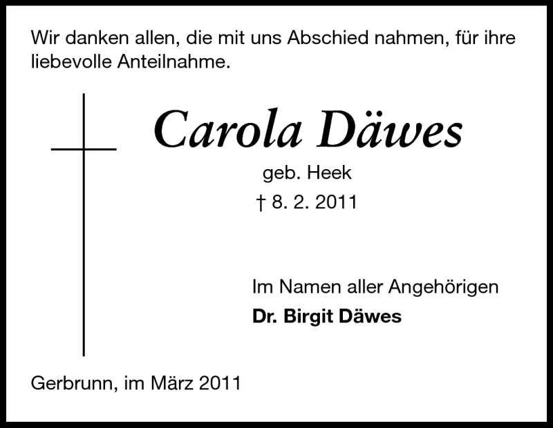 Hier finden Sie alle Traueranzeigen aus der Zeitung, die bisher für Carola Däwes erschienen sind. Weitere Traueranzeigen, die in der Zeitung erscheinen, werden hier ebenfalls aufgelistet