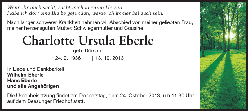 Hier finden Sie alle Traueranzeigen aus der Zeitung, die bisher für Charlotte Ursula Eberle erschienen sind. Weitere Traueranzeigen, die in der Zeitung erscheinen, werden hier ebenfalls aufgelistet
