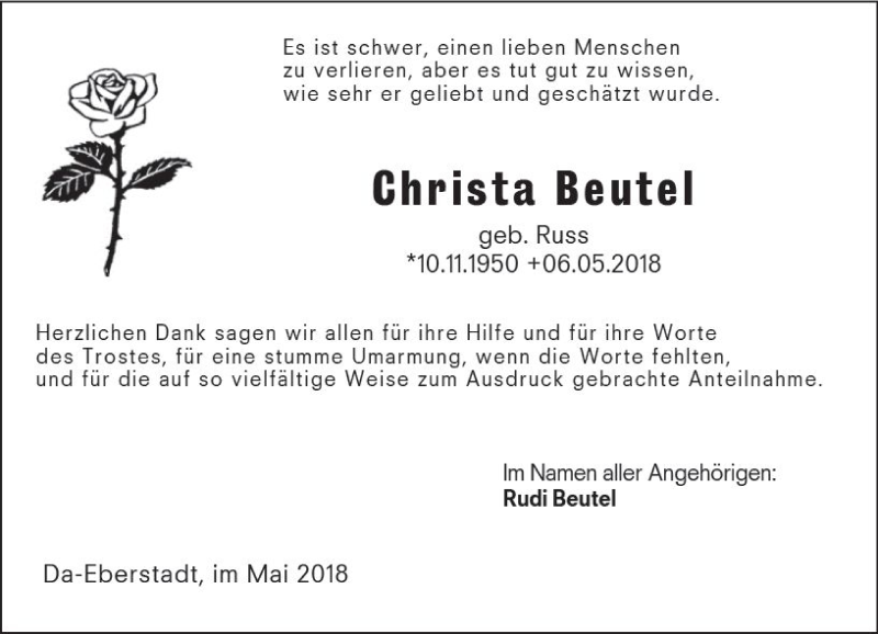 Hier finden Sie alle Traueranzeigen aus der Zeitung, die bisher für Christa Beutel erschienen sind. Weitere Traueranzeigen, die in der Zeitung erscheinen, werden hier ebenfalls aufgelistet