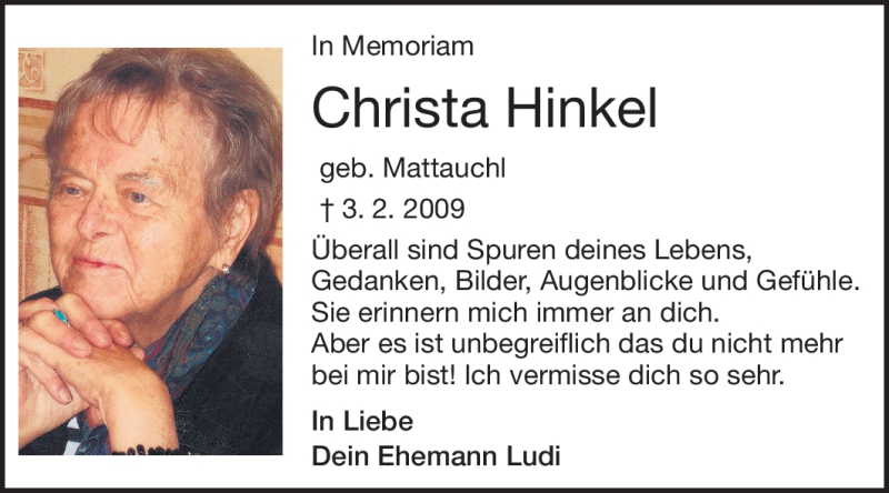 Hier finden Sie alle Traueranzeigen aus der Zeitung, die bisher für Christa Hinkel erschienen sind. Weitere Traueranzeigen, die in der Zeitung erscheinen, werden hier ebenfalls aufgelistet