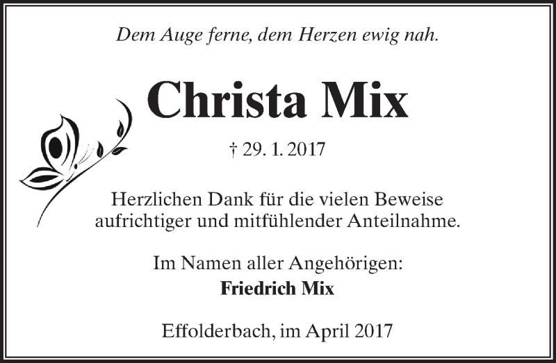 Hier finden Sie alle Traueranzeigen aus der Zeitung, die bisher für Christa Mix erschienen sind. Weitere Traueranzeigen, die in der Zeitung erscheinen, werden hier ebenfalls aufgelistet