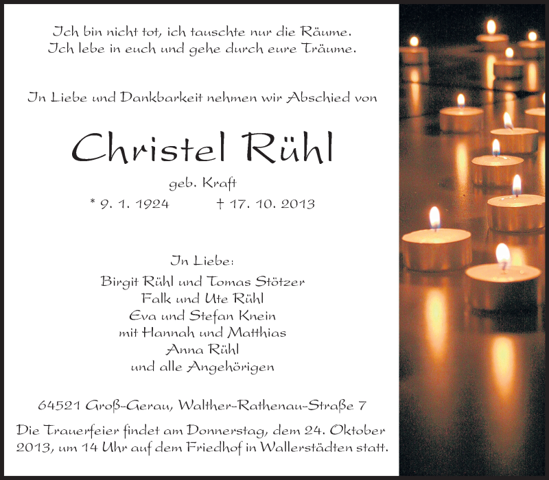 Hier finden Sie alle Traueranzeigen aus der Zeitung, die bisher für Christel Rühl erschienen sind. Weitere Traueranzeigen, die in der Zeitung erscheinen, werden hier ebenfalls aufgelistet