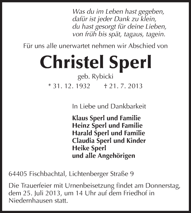 Hier finden Sie alle Traueranzeigen aus der Zeitung, die bisher für Christel Sperl erschienen sind. Weitere Traueranzeigen, die in der Zeitung erscheinen, werden hier ebenfalls aufgelistet