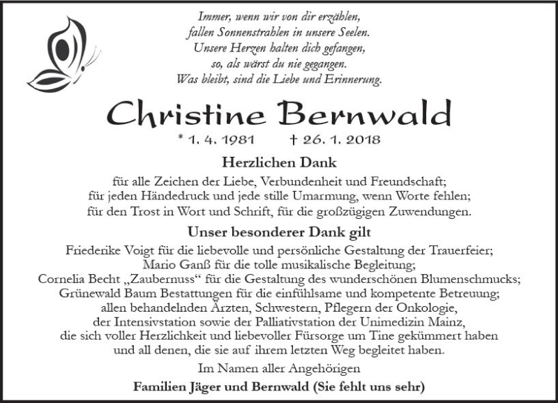 Hier finden Sie alle Traueranzeigen aus der Zeitung, die bisher für Christine Bernwald erschienen sind. Weitere Traueranzeigen, die in der Zeitung erscheinen, werden hier ebenfalls aufgelistet