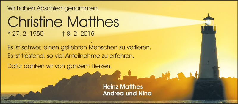 Hier finden Sie alle Traueranzeigen aus der Zeitung, die bisher für Christine Matthes erschienen sind. Weitere Traueranzeigen, die in der Zeitung erscheinen, werden hier ebenfalls aufgelistet