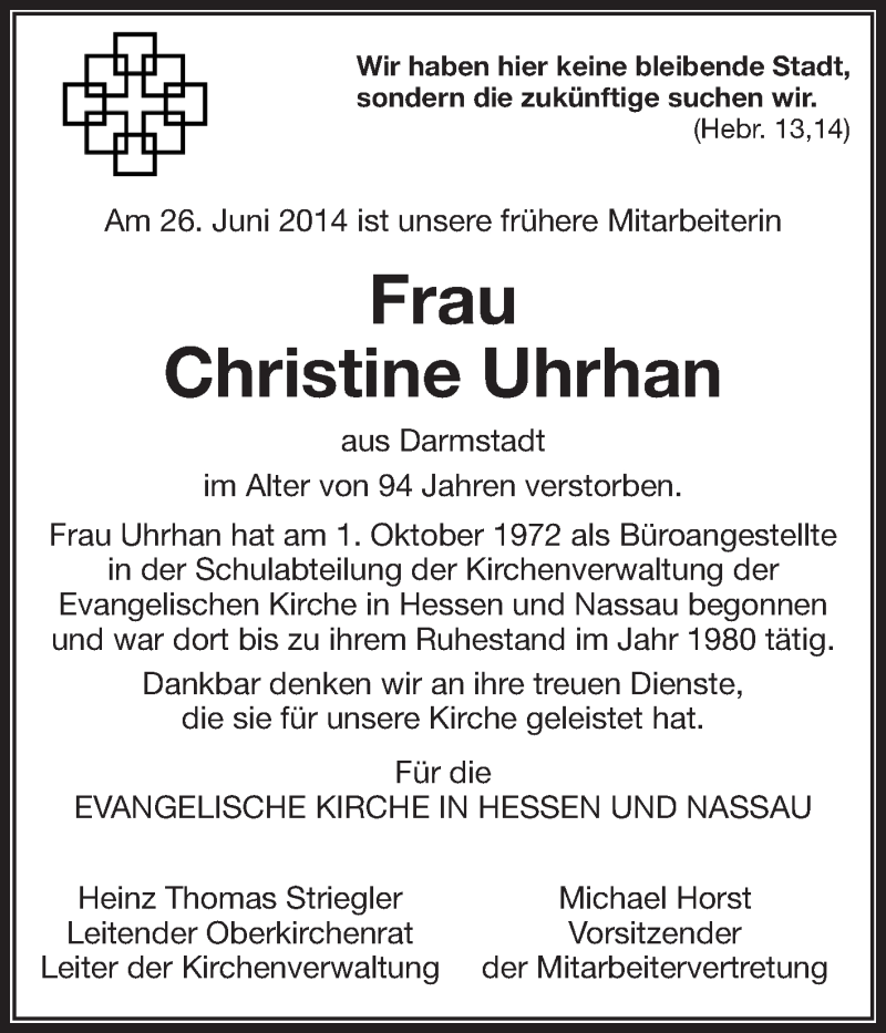 Hier finden Sie alle Traueranzeigen aus der Zeitung, die bisher für Christine Uhrhan erschienen sind. Weitere Traueranzeigen, die in der Zeitung erscheinen, werden hier ebenfalls aufgelistet