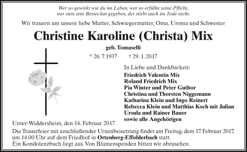 Hier finden Sie alle Traueranzeigen aus der Zeitung, die bisher für Christine Karoline Mix erschienen sind. Weitere Traueranzeigen, die in der Zeitung erscheinen, werden hier ebenfalls aufgelistet