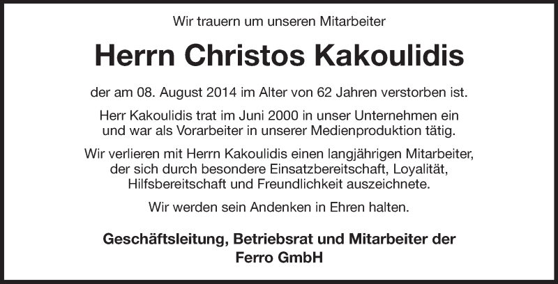 Hier finden Sie alle Traueranzeigen aus der Zeitung, die bisher für Christos Kakoulidis erschienen sind. Weitere Traueranzeigen, die in der Zeitung erscheinen, werden hier ebenfalls aufgelistet
