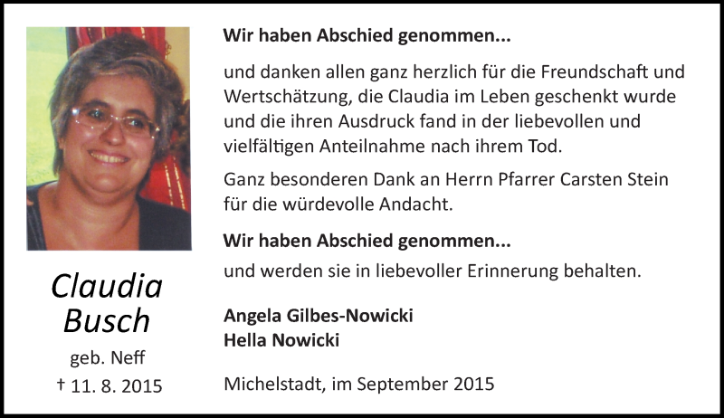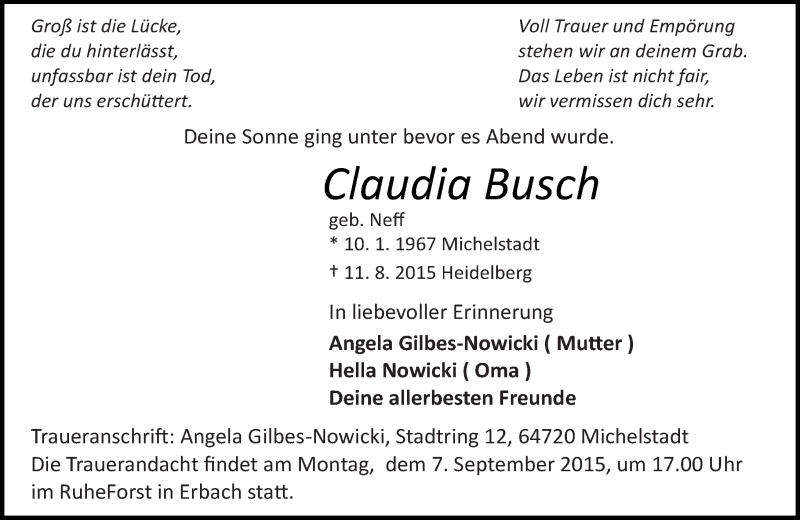 Hier finden Sie alle Traueranzeigen aus der Zeitung, die bisher für Claudia Busch erschienen sind. Weitere Traueranzeigen, die in der Zeitung erscheinen, werden hier ebenfalls aufgelistet