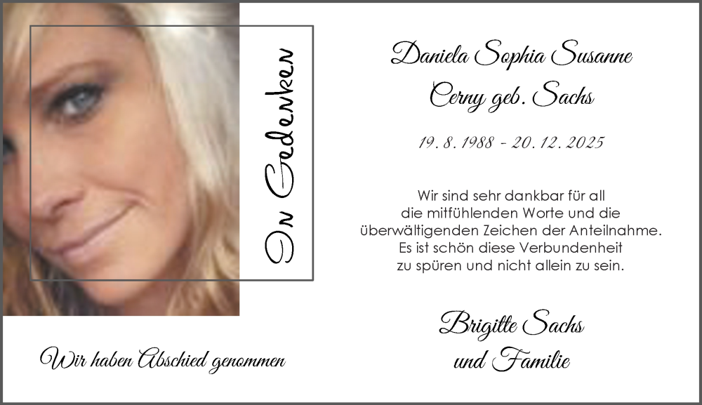 Hier finden Sie alle Traueranzeigen aus der Zeitung, die bisher für Daniela Sophia Susanne Cerny erschienen sind. Weitere Traueranzeigen, die in der Zeitung erscheinen, werden hier ebenfalls aufgelistet