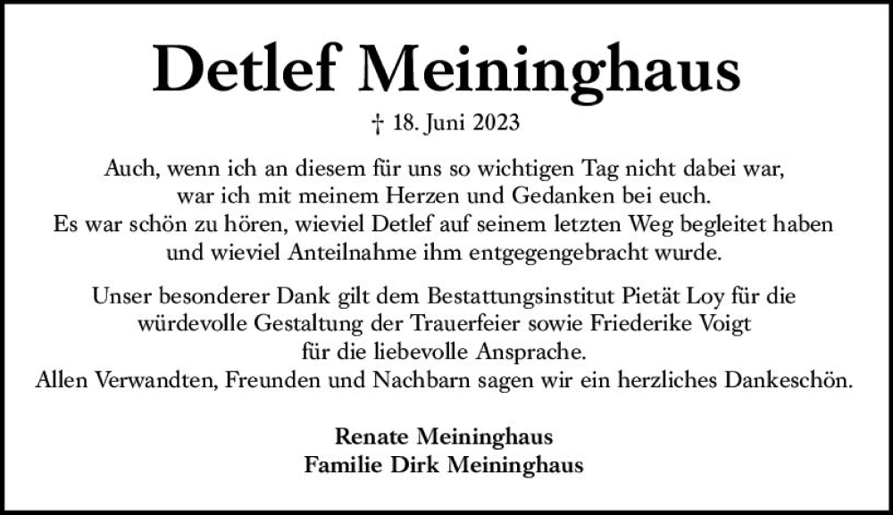 Hier finden Sie alle Traueranzeigen aus der Zeitung, die bisher für Detlef Meininghaus erschienen sind. Weitere Traueranzeigen, die in der Zeitung erscheinen, werden hier ebenfalls aufgelistet