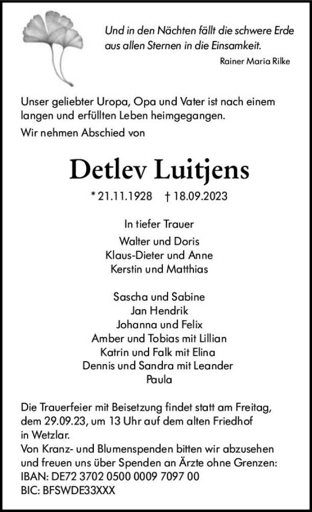 Hier finden Sie alle Traueranzeigen aus der Zeitung, die bisher für Detlev Luitjens erschienen sind. Weitere Traueranzeigen, die in der Zeitung erscheinen, werden hier ebenfalls aufgelistet