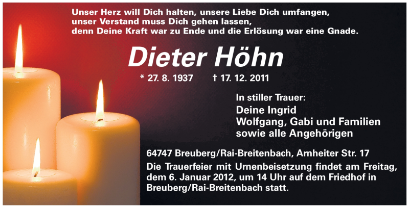 Hier finden Sie alle Traueranzeigen aus der Zeitung, die bisher für Dieter Höhn erschienen sind. Weitere Traueranzeigen, die in der Zeitung erscheinen, werden hier ebenfalls aufgelistet