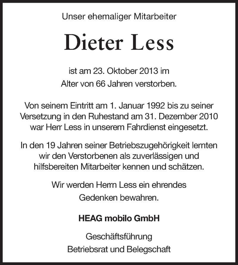 Hier finden Sie alle Traueranzeigen aus der Zeitung, die bisher für Dieter Less erschienen sind. Weitere Traueranzeigen, die in der Zeitung erscheinen, werden hier ebenfalls aufgelistet