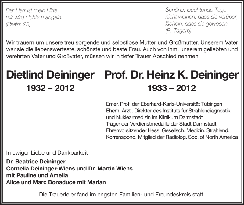 Hier finden Sie alle Traueranzeigen aus der Zeitung, die bisher für Dietlind Deininger erschienen sind. Weitere Traueranzeigen, die in der Zeitung erscheinen, werden hier ebenfalls aufgelistet