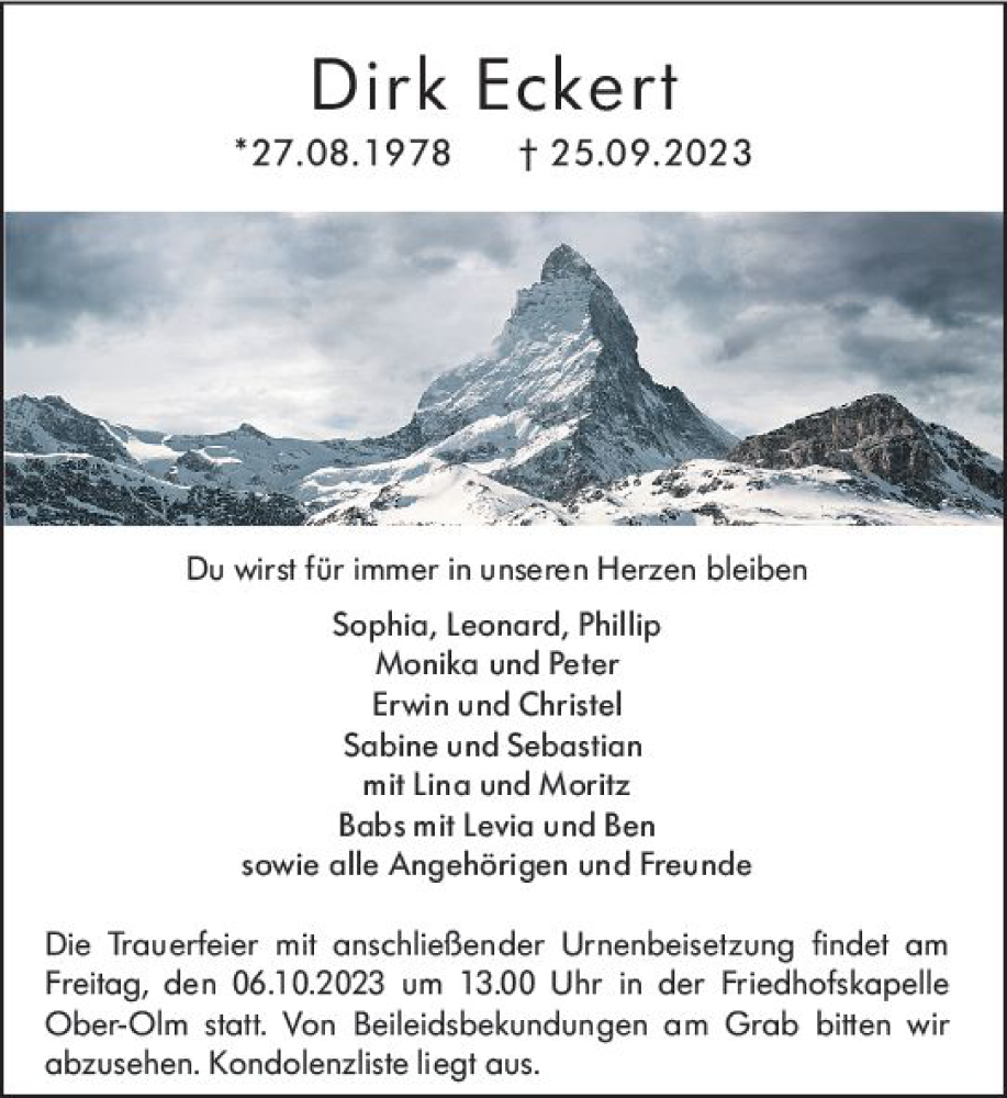 Hier finden Sie alle Traueranzeigen aus der Zeitung, die bisher für Dirk Eckert erschienen sind. Weitere Traueranzeigen, die in der Zeitung erscheinen, werden hier ebenfalls aufgelistet