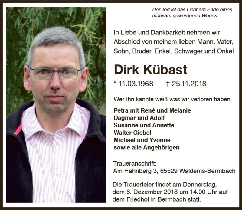 Hier finden Sie alle Traueranzeigen aus der Zeitung, die bisher für Dirk Kübast erschienen sind. Weitere Traueranzeigen, die in der Zeitung erscheinen, werden hier ebenfalls aufgelistet