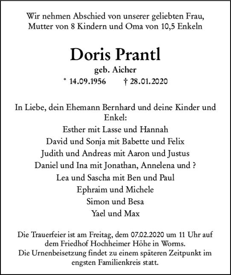 Hier finden Sie alle Traueranzeigen aus der Zeitung, die bisher für Doris Prantl erschienen sind. Weitere Traueranzeigen, die in der Zeitung erscheinen, werden hier ebenfalls aufgelistet