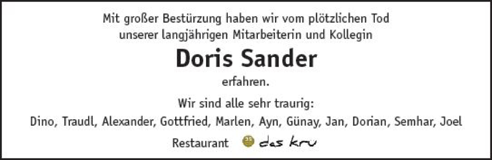 Hier finden Sie alle Traueranzeigen aus der Zeitung, die bisher für Doris Sander erschienen sind. Weitere Traueranzeigen, die in der Zeitung erscheinen, werden hier ebenfalls aufgelistet