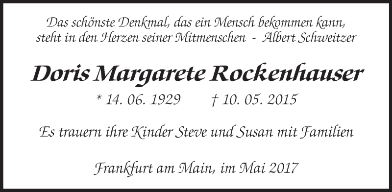 Hier finden Sie alle Traueranzeigen aus der Zeitung, die bisher für Doris Margarete Rockenfiauser erschienen sind. Weitere Traueranzeigen, die in der Zeitung erscheinen, werden hier ebenfalls aufgelistet