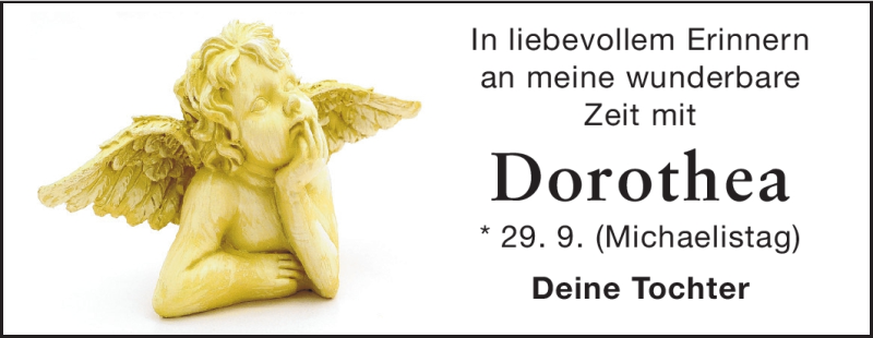 Hier finden Sie alle Traueranzeigen aus der Zeitung, die bisher für Dorothea erschienen sind. Weitere Traueranzeigen, die in der Zeitung erscheinen, werden hier ebenfalls aufgelistet
