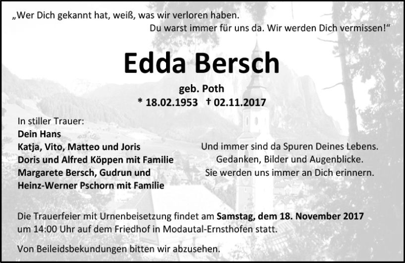 Hier finden Sie alle Traueranzeigen aus der Zeitung, die bisher für Edda Bersch erschienen sind. Weitere Traueranzeigen, die in der Zeitung erscheinen, werden hier ebenfalls aufgelistet
