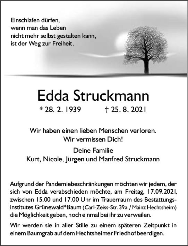 Hier finden Sie alle Traueranzeigen aus der Zeitung, die bisher für Edda Struckmann erschienen sind. Weitere Traueranzeigen, die in der Zeitung erscheinen, werden hier ebenfalls aufgelistet