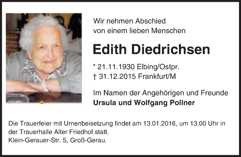 Hier finden Sie alle Traueranzeigen aus der Zeitung, die bisher für Edith Diedrichsen erschienen sind. Weitere Traueranzeigen, die in der Zeitung erscheinen, werden hier ebenfalls aufgelistet