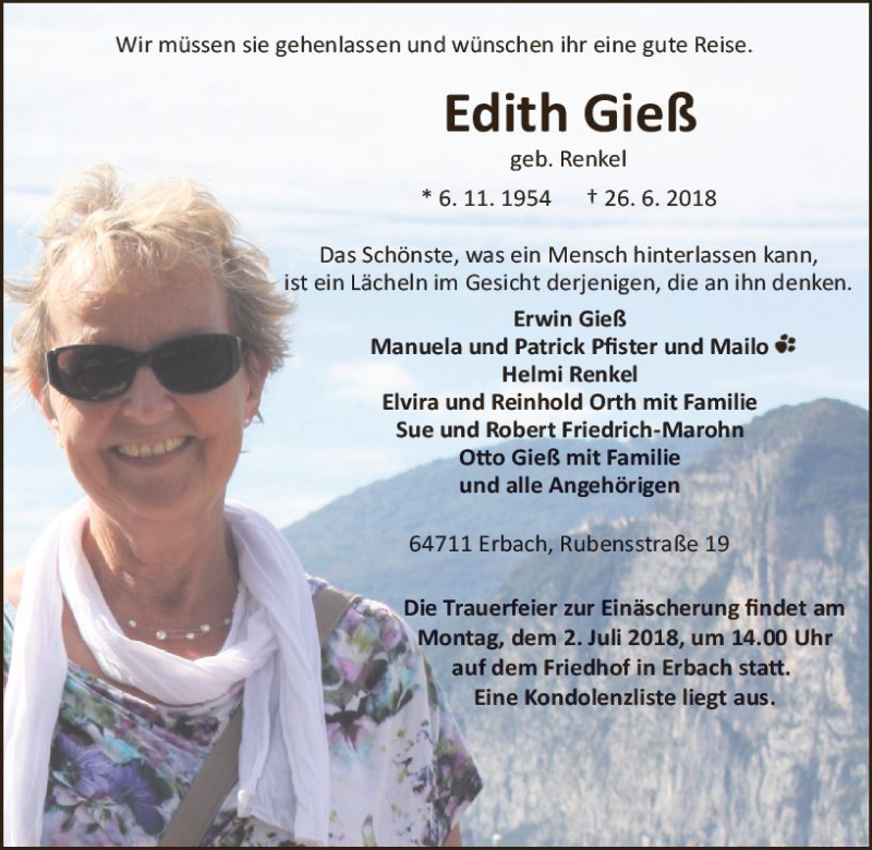 Hier finden Sie alle Traueranzeigen aus der Zeitung, die bisher für Edith Gieß erschienen sind. Weitere Traueranzeigen, die in der Zeitung erscheinen, werden hier ebenfalls aufgelistet