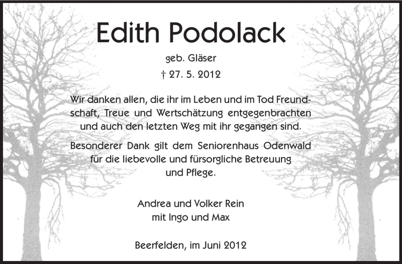 Hier finden Sie alle Traueranzeigen aus der Zeitung, die bisher für Edith Podolack erschienen sind. Weitere Traueranzeigen, die in der Zeitung erscheinen, werden hier ebenfalls aufgelistet