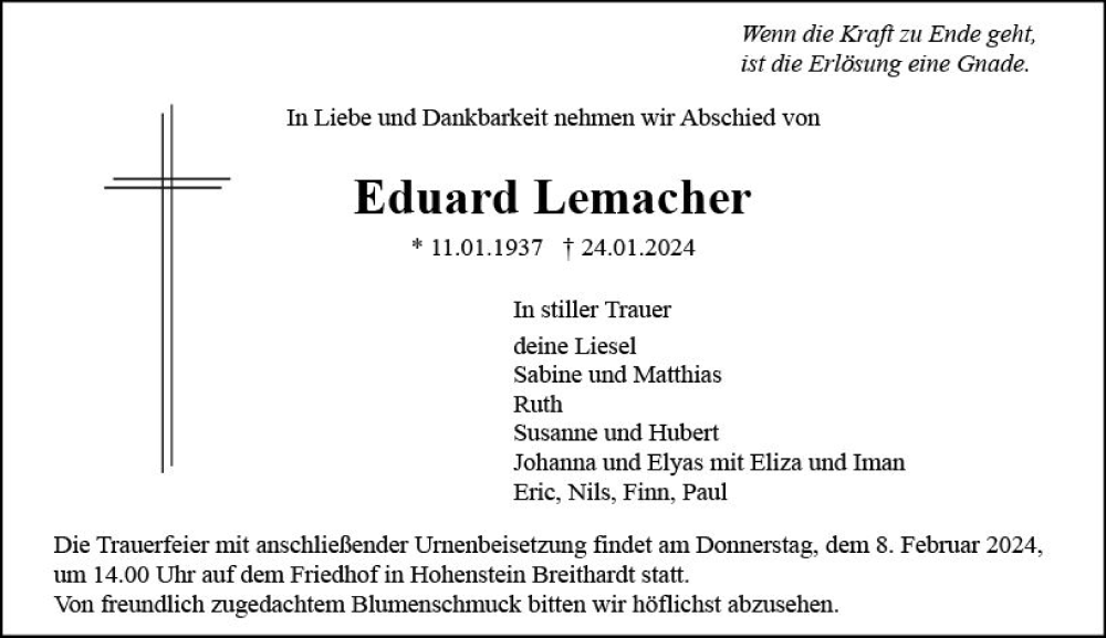 Hier finden Sie alle Traueranzeigen aus der Zeitung, die bisher für Eduard Lemacher erschienen sind. Weitere Traueranzeigen, die in der Zeitung erscheinen, werden hier ebenfalls aufgelistet