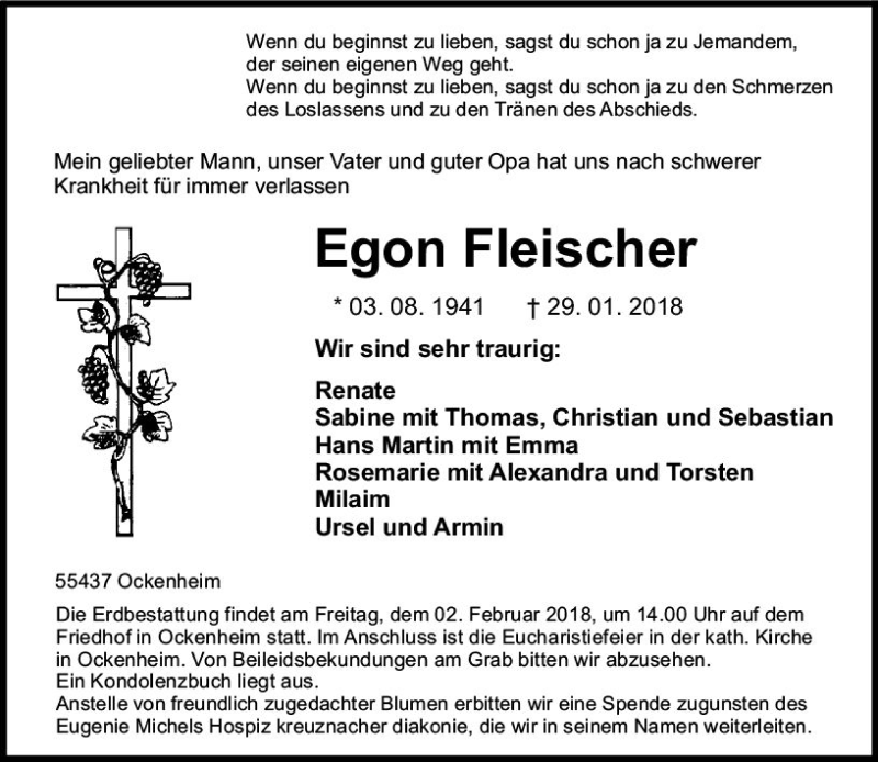 Hier finden Sie alle Traueranzeigen aus der Zeitung, die bisher für Egon Fleischer erschienen sind. Weitere Traueranzeigen, die in der Zeitung erscheinen, werden hier ebenfalls aufgelistet