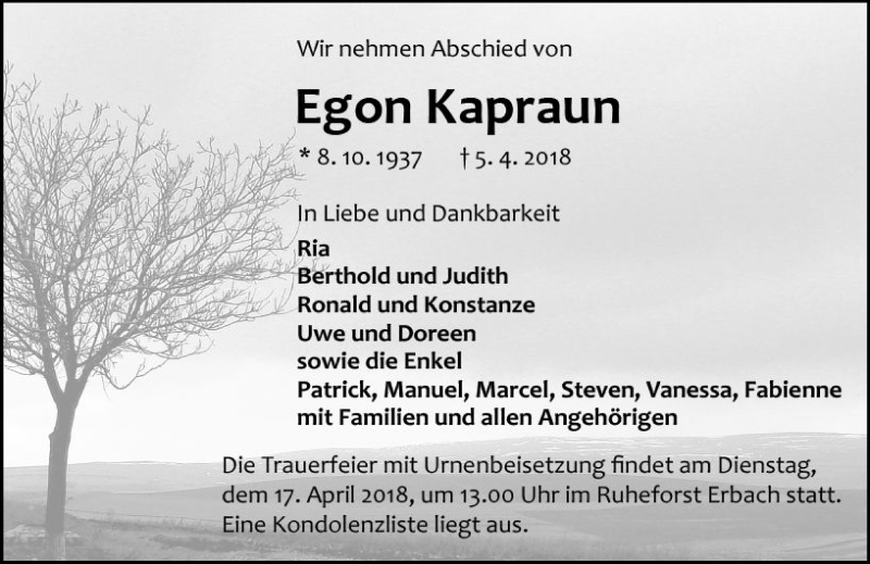 Hier finden Sie alle Traueranzeigen aus der Zeitung, die bisher für Egon Kapraun erschienen sind. Weitere Traueranzeigen, die in der Zeitung erscheinen, werden hier ebenfalls aufgelistet