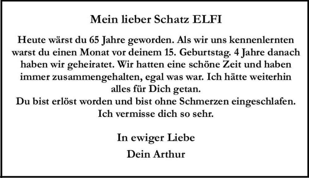 Hier finden Sie alle Traueranzeigen aus der Zeitung, die bisher für Elfi erschienen sind. Weitere Traueranzeigen, die in der Zeitung erscheinen, werden hier ebenfalls aufgelistet