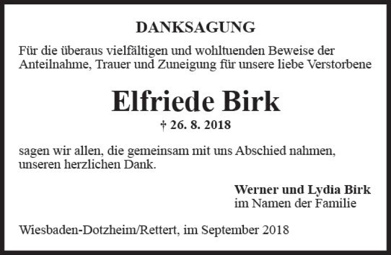 Hier finden Sie alle Traueranzeigen aus der Zeitung, die bisher für Elfriede Birk erschienen sind. Weitere Traueranzeigen, die in der Zeitung erscheinen, werden hier ebenfalls aufgelistet