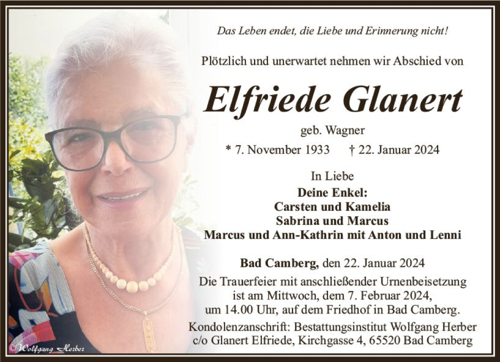 Hier finden Sie alle Traueranzeigen aus der Zeitung, die bisher für Elfriede Glanert erschienen sind. Weitere Traueranzeigen, die in der Zeitung erscheinen, werden hier ebenfalls aufgelistet