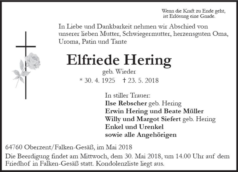 Hier finden Sie alle Traueranzeigen aus der Zeitung, die bisher für Elfriede Hering erschienen sind. Weitere Traueranzeigen, die in der Zeitung erscheinen, werden hier ebenfalls aufgelistet