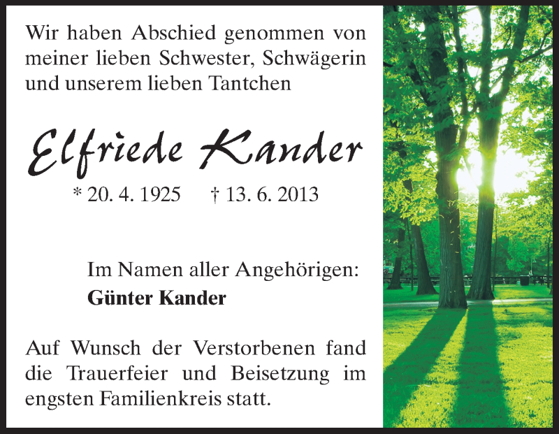 Hier finden Sie alle Traueranzeigen aus der Zeitung, die bisher für Elfriede Kander erschienen sind. Weitere Traueranzeigen, die in der Zeitung erscheinen, werden hier ebenfalls aufgelistet