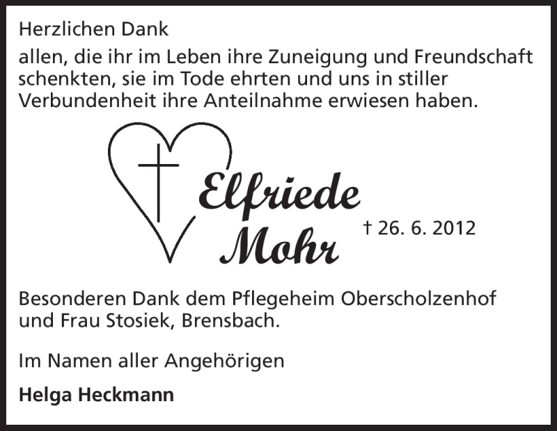 Hier finden Sie alle Traueranzeigen aus der Zeitung, die bisher für Elfriede Mohr erschienen sind. Weitere Traueranzeigen, die in der Zeitung erscheinen, werden hier ebenfalls aufgelistet