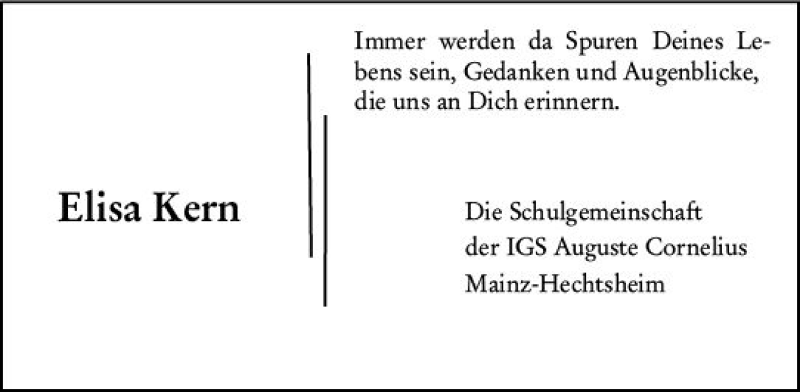 Hier finden Sie alle Traueranzeigen aus der Zeitung, die bisher für Elisa Kern erschienen sind. Weitere Traueranzeigen, die in der Zeitung erscheinen, werden hier ebenfalls aufgelistet