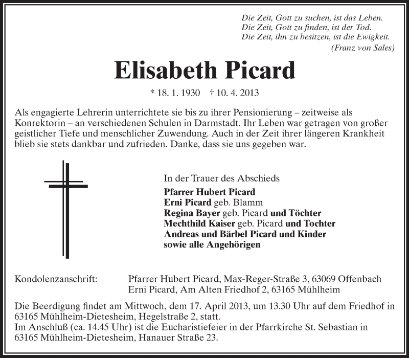 Hier finden Sie alle Traueranzeigen aus der Zeitung, die bisher für Elisabeth Picard erschienen sind. Weitere Traueranzeigen, die in der Zeitung erscheinen, werden hier ebenfalls aufgelistet