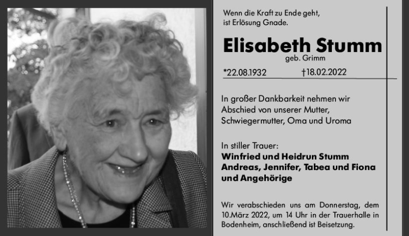 Hier finden Sie alle Traueranzeigen aus der Zeitung, die bisher für Elisabeth Stumm erschienen sind. Weitere Traueranzeigen, die in der Zeitung erscheinen, werden hier ebenfalls aufgelistet