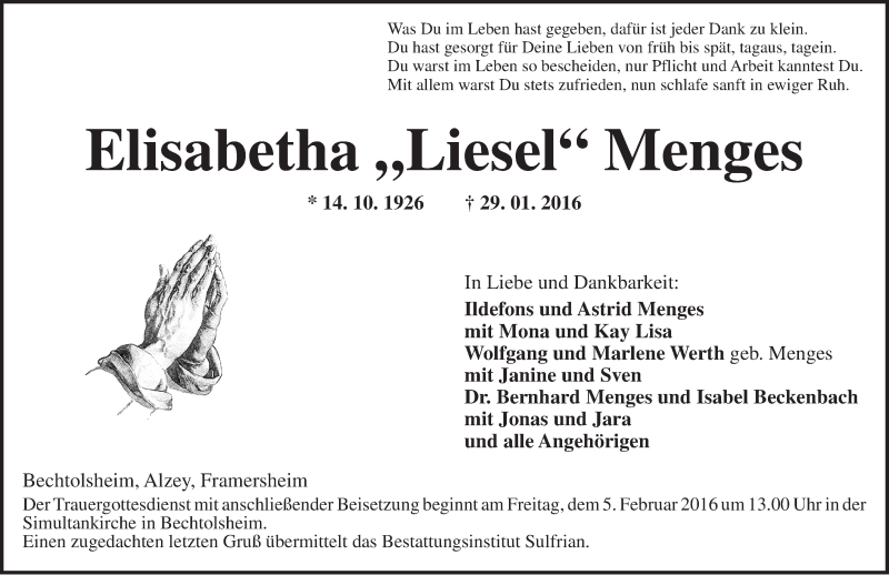 Hier finden Sie alle Traueranzeigen aus der Zeitung, die bisher für Elisabetha Menges erschienen sind. Weitere Traueranzeigen, die in der Zeitung erscheinen, werden hier ebenfalls aufgelistet