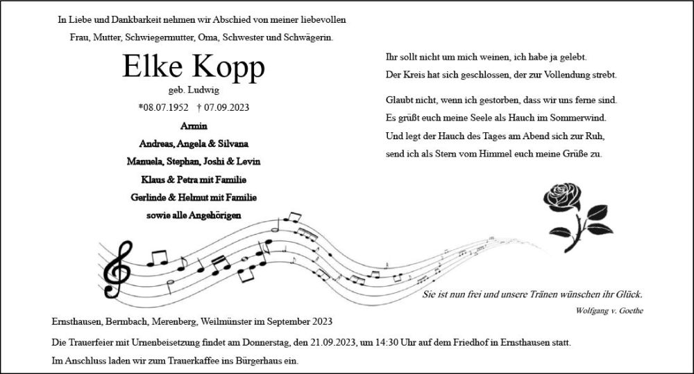 Hier finden Sie alle Traueranzeigen aus der Zeitung, die bisher für Elke Kopp erschienen sind. Weitere Traueranzeigen, die in der Zeitung erscheinen, werden hier ebenfalls aufgelistet
