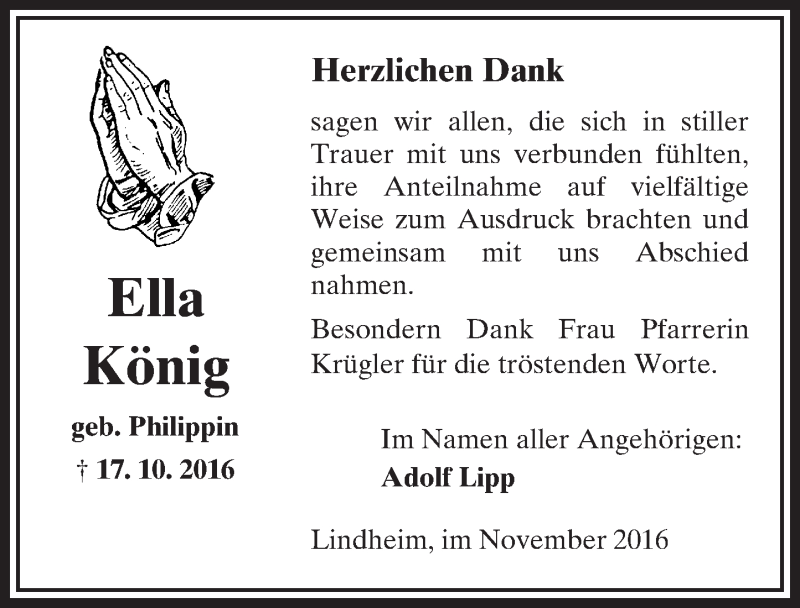 Hier finden Sie alle Traueranzeigen aus der Zeitung, die bisher für Ella König erschienen sind. Weitere Traueranzeigen, die in der Zeitung erscheinen, werden hier ebenfalls aufgelistet