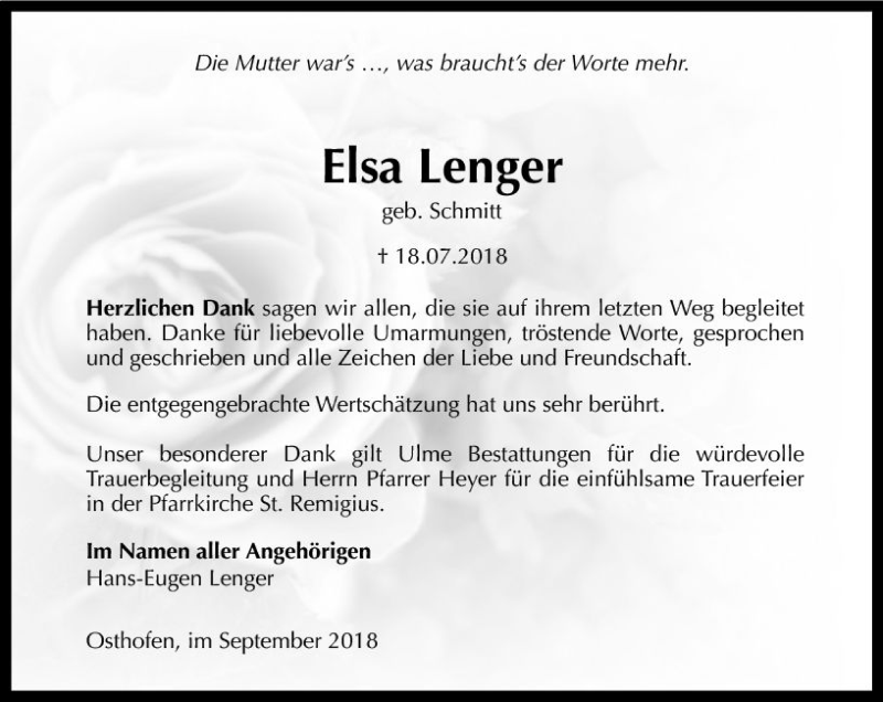 Hier finden Sie alle Traueranzeigen aus der Zeitung, die bisher für Elsa Lenger erschienen sind. Weitere Traueranzeigen, die in der Zeitung erscheinen, werden hier ebenfalls aufgelistet