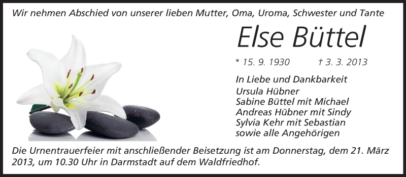 Hier finden Sie alle Traueranzeigen aus der Zeitung, die bisher für Else Büttel erschienen sind. Weitere Traueranzeigen, die in der Zeitung erscheinen, werden hier ebenfalls aufgelistet