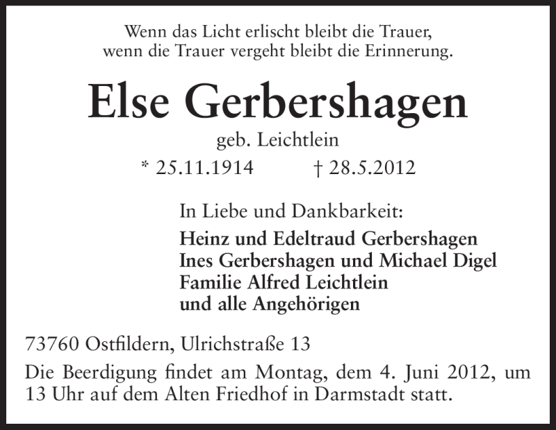 Hier finden Sie alle Traueranzeigen aus der Zeitung, die bisher für Else Gerbershagen erschienen sind. Weitere Traueranzeigen, die in der Zeitung erscheinen, werden hier ebenfalls aufgelistet